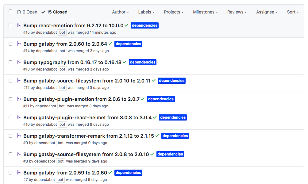 このブログはGatsby.jsでビルドしてGitHub Pagesにホスティングしているんだけど、ビルドするために必要なライブラリをdependabotを使って自動的にアップデートするようにしたところ、とても快適になった。