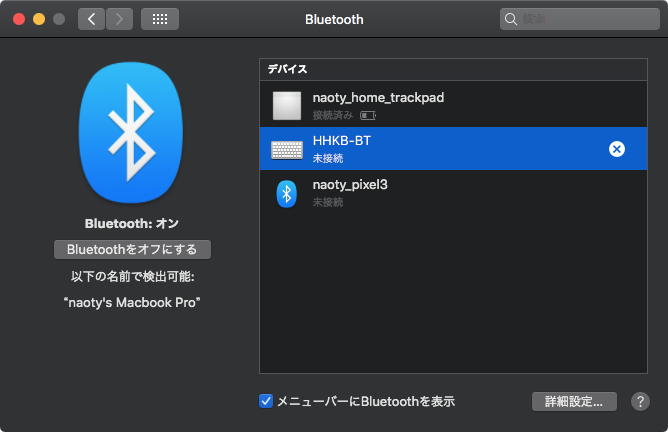 Fn + qを押す。そうすると、HHKB-BTは接続が切れてペアリングモードになる。- 接続したいMacのbluetoothの設定からHHKB-BTをクリックすると接続される。