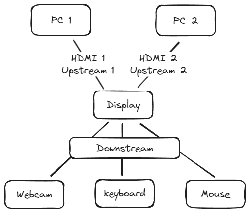 自分のディスプレイにはアップストリームのポートが2つあることに気がついた。ということは、2台のPCをアップストリームに接続して、ダウンストリームに接続したUSB機器を共有できるということなので、これはまさにKVMスイッチということになる。