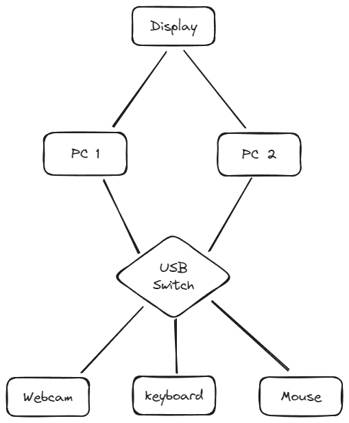 こんなイメージ。USBスイッチのスイッチを押すと、USB機器の接続先が切り替わる。